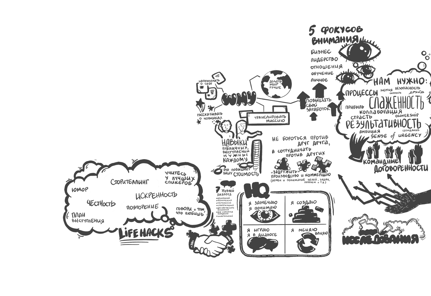 Скрайбер слушает выступление спикера, бизнес-бэкграунд и большой налет практики позволяет ему выделить основные тезисы и зафиксировать их, одновременно с выступлением спикера