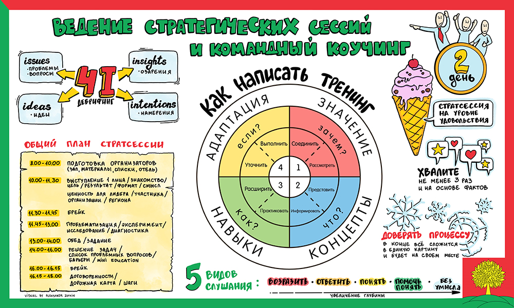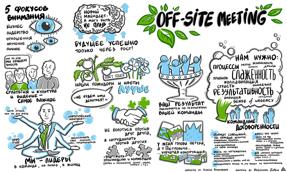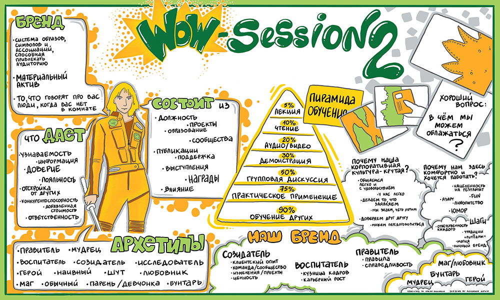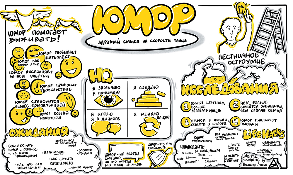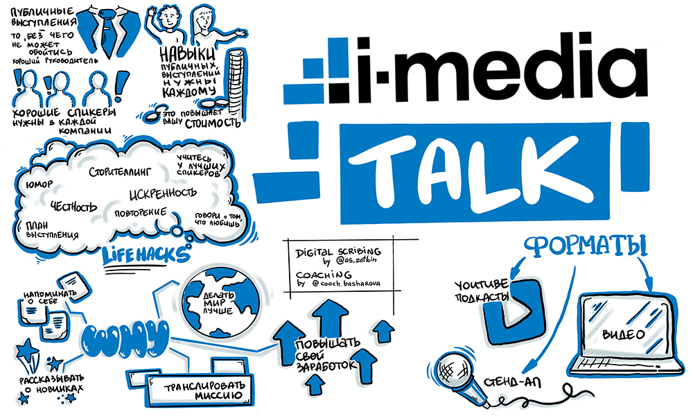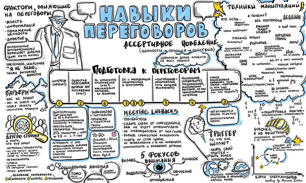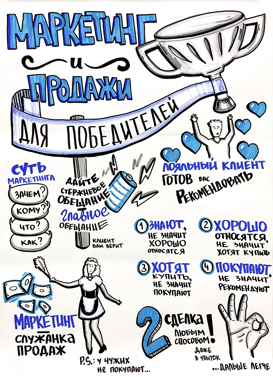 Скрайбер слушает выступление спикера, бизнес-бэкграунд и большой налет практики позволяет ему выделить основные тезисы и зафиксировать их, одновременно с выступлением спикера