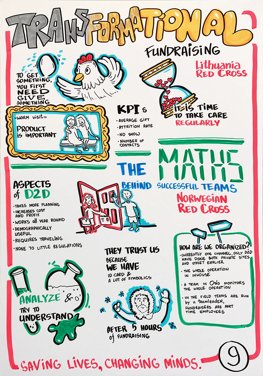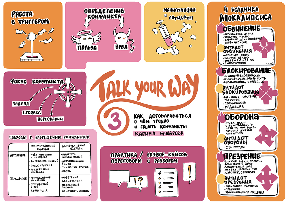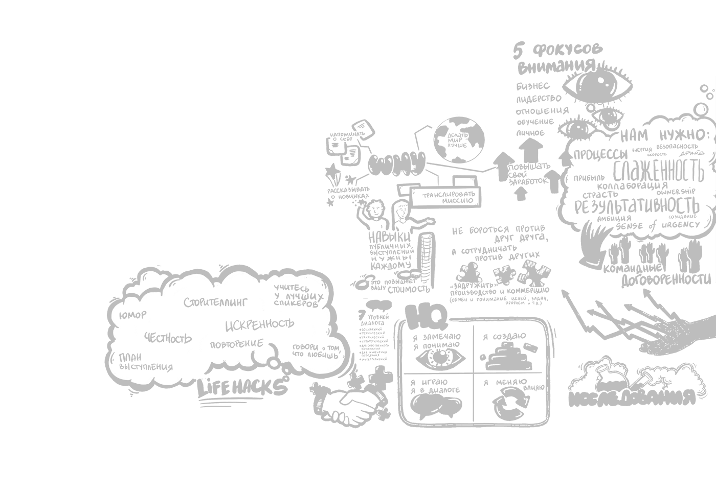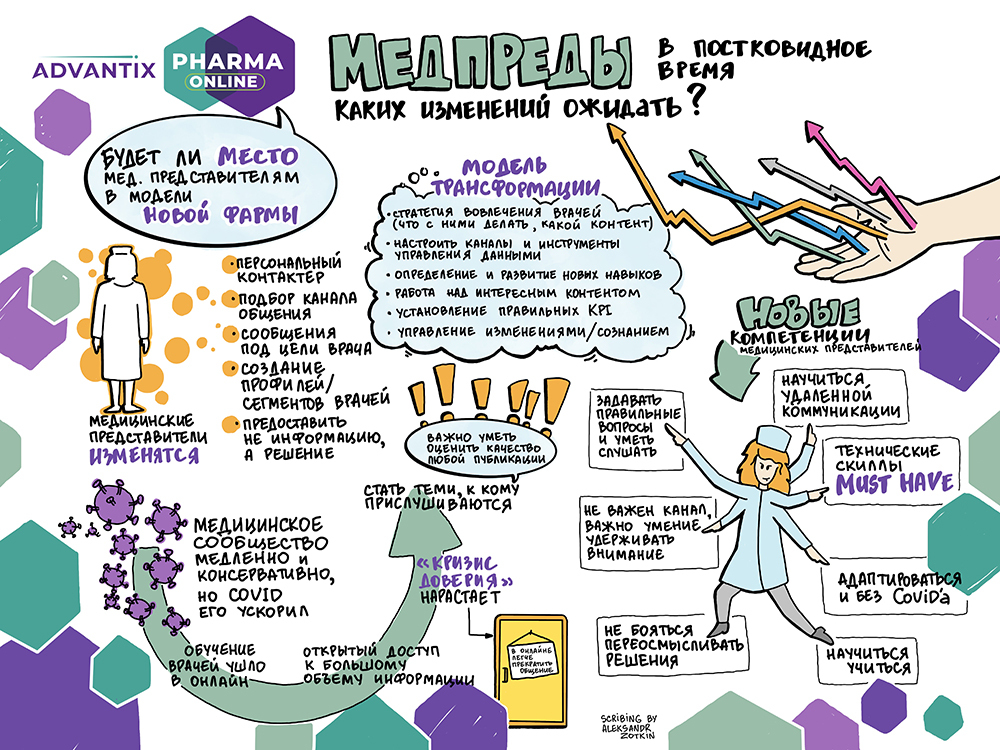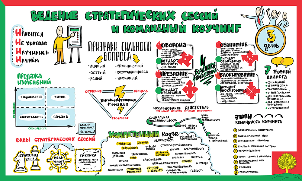 Скрайбер слушает выступление спикера, бизнес-бэкграунд и большой налет практики позволяет ему выделить основные тезисы и зафиксировать их, одновременно с выступлением спикера